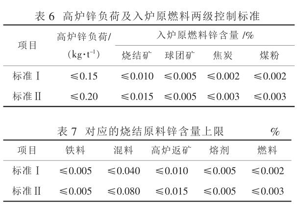 高爐中的鋅主要來源于燒結(jié)礦, 而燒結(jié)礦中的鋅主要來源于燒結(jié)混料,因此,結(jié)合煉鐵總廠用料實際情況, 初步制定高爐鋅負荷及入爐原燃料兩級控制標準(見表 6 )和對應的燒結(jié)原料鋅含量上限(見表 7 )。 由于球團、燒結(jié)用鐵礦原料等含鋅都極低、無需限定,日常應重點監(jiān)控混料。 混料中鋅主要來自高爐干法灰、瓦斯泥,只要燒結(jié)工序停止配加這三種物料,即可切斷鋅的循環(huán)路徑,逐步降低高爐鋅負荷。