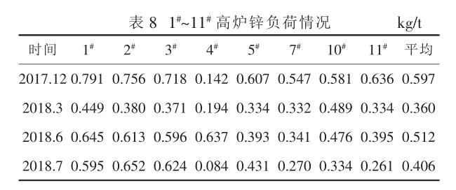 由表 8 可以看出,相比于 2017 年 12 月, 2018年 3 、 6 、 7 月各高爐鋅負荷均有所下降, 高爐鋅負荷 平 均 值 分 別 降 低 了 0.237 kg/t 、 0.085 kg/t 、0.191 kg/t 。
