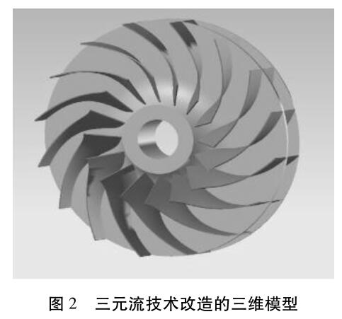 葉輪改造主要通過葉輪內(nèi)部的三元立體空間無限地分割,通過對葉輪流道內(nèi)各工作點的分析,建立起完整、真實的葉輪內(nèi)流體流動的數(shù)學(xué)模型,依據(jù)三元流動理論設(shè)計出來的葉片形狀為不規(guī)則曲面形狀,葉輪葉片的結(jié)構(gòu)可適應(yīng)流體的真實流態(tài),能夠有效控制葉輪內(nèi)部流體質(zhì)點的速度分布。改造后的轉(zhuǎn)子新葉輪如圖 6。