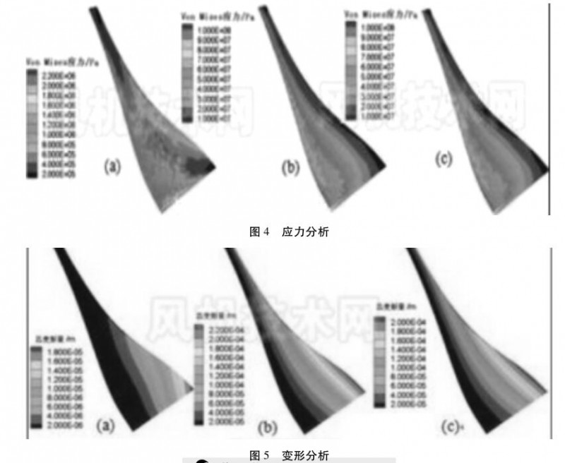 對于風(fēng)機葉輪設(shè)計根據(jù)所選用的材料進行強度效核是必須進行的程序,本文對葉輪的強度效核所采用的方法,是將葉輪整體作為計算幾何模型進行有限元網(wǎng)格剖分,同時為保證結(jié)構(gòu)離散化的計算精度和內(nèi)存空間的有效利用,運用計算強度的軟件進行 10 節(jié)點的四面體單元網(wǎng)格剖分進行強度效核,校核的結(jié)果是該三元流葉輪有足夠的強度滿足運行要求,圖 4、圖 5 為 SJ9500 三元流葉輪葉片強度分析的結(jié)果。