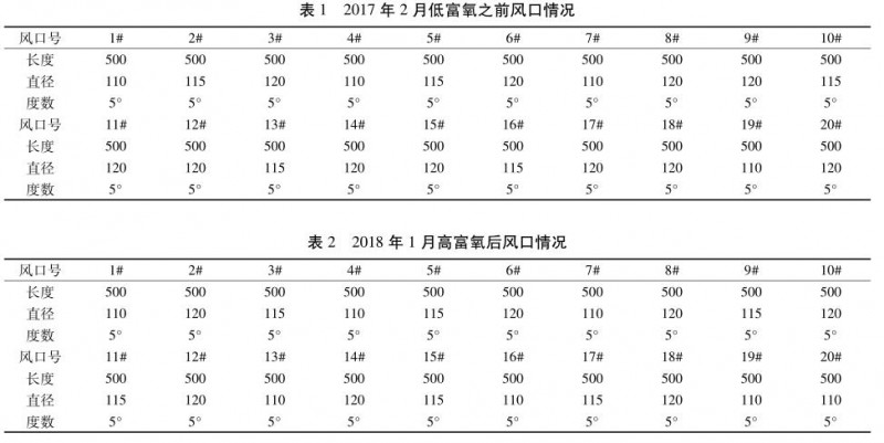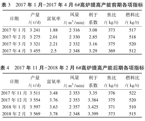 提高富氧率,增大富氧量。高爐富氧的最大效果是增加產(chǎn)量,理論上鼓風(fēng)中提高 1%增產(chǎn) 4.76%,在實際生產(chǎn)中 6#爐富氧量由 3 000 m3 /h 提高至7 000 m3 /h,富氧率由 1.91%提高到 3.65%。富氧鼓風(fēng)提高強化冶煉后: 爐內(nèi)煤氣量增多,提高了煤粉燃燒率,同時爐缸溫度升高使軟熔帶下移,一定程度上抑制了硅還原的作用。理論上富氧率提高 1%理論燃燒溫度提高 43 ℃,一般通過提高煤比或鼓風(fēng)加濕保持理論燃燒溫度在合理范圍。風(fēng)量不變富氧增加時,爐腹煤氣量增加回旋區(qū)縮短,煤氣初始分布靠向邊緣。
