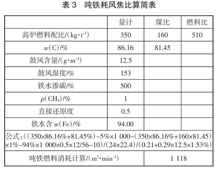 根據(jù)燃料指標計算出噸鐵耗風(fēng)量為 1 091 m3 ,詳細計算方法,見表 3。
