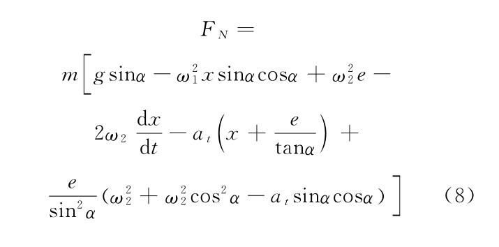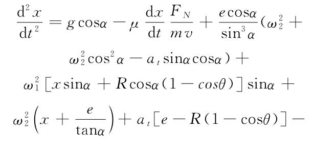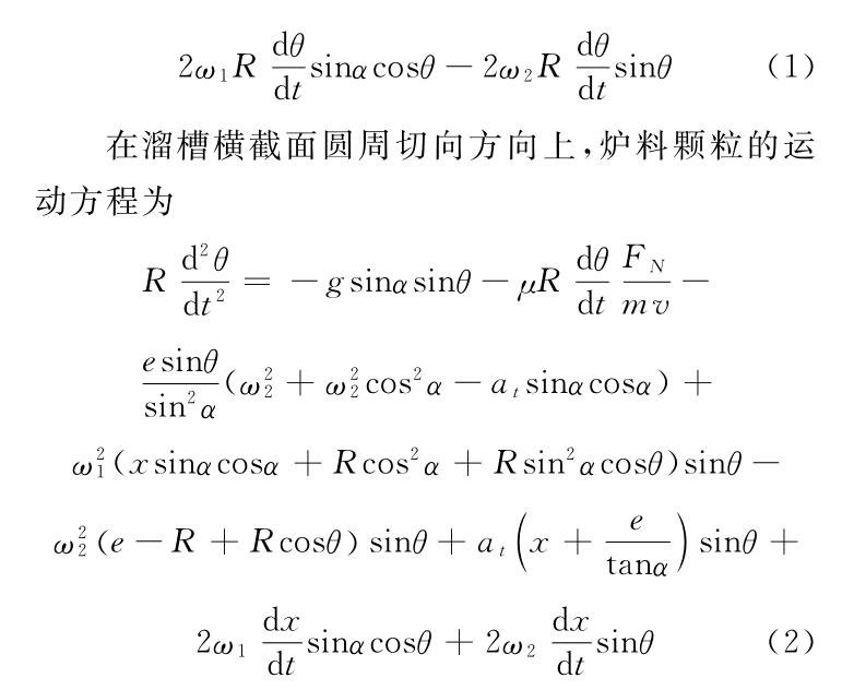 以上式中 μ 為爐料摩擦系數;ω1 ,ω2分別為溜槽水平圓周旋轉和傾動旋轉的角速度(rad/S);at為溜槽傾動角加速度rad/S2);r1,r2分別為爐料顆粒距溜槽水平圓周旋轉中心軸和傾動中心軸的矢徑(m);v為爐料顆粒相對運動速度(m/s)。