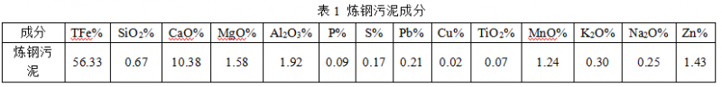 轉(zhuǎn)爐煉鋼污泥(下稱煉鋼污泥),是煙氣濕法除塵所產(chǎn)生的,轉(zhuǎn)爐年產(chǎn)生的煉鋼污泥量約10萬噸以上,含水分25-30%,干基的煉鋼污泥TFe約50%以上,粒度200目占 90%以上,成分見表1。