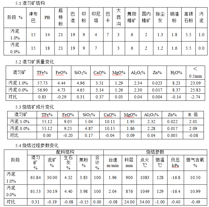 5.8.3污泥配加1.0%對混勻過程、燒結(jié)參數(shù)、燒結(jié)礦物理性能無大幅影響。