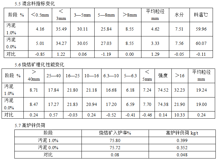 5.8.1污泥配加1.0%后混勻礦Zn含量升上0.004%、燒結(jié)礦Zn含量上升0.005%。