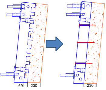 金屬陶瓷預(yù)掛渣皮技術(shù),材料采用高鋼纖維作為骨料,不定形耐材作為漿體填充,因此材料具備類金屬特點(diǎn),高導(dǎo)熱、高韌性。目前已經(jīng)在國內(nèi)大中小高爐上普遍應(yīng)用,且使用效果較理想。隨著該澆注材料成熟應(yīng)用,可引發(fā)我們對冷卻壁結(jié)構(gòu)思路的轉(zhuǎn)變。傳統(tǒng)冷卻壁結(jié)構(gòu)為燕尾槽式,主要為鑲磚設(shè)置,而不定形澆注材料則不需燕尾槽結(jié)構(gòu),只需簡單錨固即可將材料與冷卻壁澆注貼合。如圖7所示,取消冷卻壁燕尾槽,板面厚度和面積不變,設(shè)置螺栓孔,從背部安裝螺栓作為澆注料錨固件。該設(shè)計(jì)將減薄冷卻壁厚度約30%,減少材料用量25%,大大降低冷卻壁制作難度,成本預(yù)計(jì)降低30%以上。因此,高導(dǎo)熱高強(qiáng)度的預(yù)掛渣皮材料,改變了高爐內(nèi)襯冷卻系統(tǒng)設(shè)計(jì),大大降低了高爐設(shè)計(jì)成本。