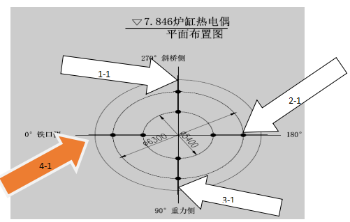 情況分析;3-1、4-1熱電偶處于第二代、第三代冷卻壁接縫處,此處耐材砌筑厚度750mm、熱電偶插深520mm深度,角度處于鐵口東西兩側(cè),當(dāng)前溫度與歷史最高溫度、穩(wěn)產(chǎn)平均溫度相比,均低于此處溫度,證明此熱電偶范圍內(nèi)碳磚侵蝕正常,屬于安全狀態(tài);
