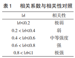 相關系數(shù)r的取值范圍為1~-1,1表示兩變量完全線性正相關,-1表示兩變量完全線性負相關,0 表示兩變量不相關,相關程度如表1所示。