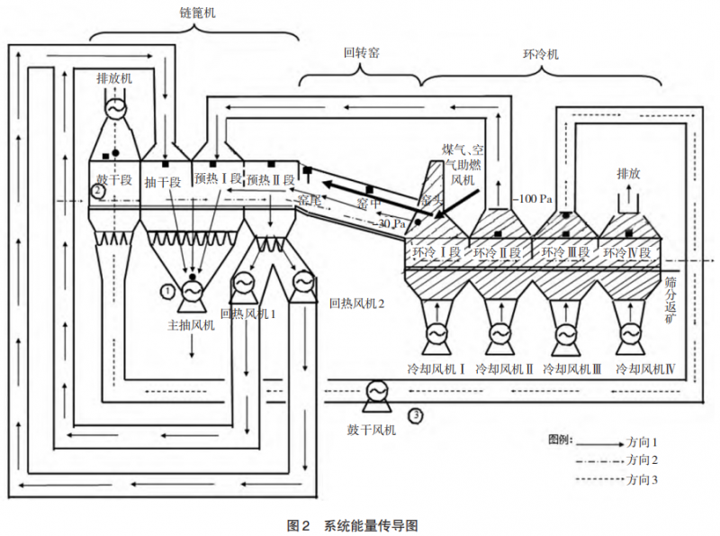 根據數(shù)據相關性情況,繪制系統(tǒng)主要因素關聯(lián)圖,進一步明確系統(tǒng)能量流動方向及其關聯(lián)設備。如圖 2 所示,系統(tǒng)按能量傳導方向分為 3 個方向。方向 1:從環(huán)冷機到主抽風機,包括回熱風機 1、2。方向2:球團礦進入系統(tǒng)流經鼓干段、抽干段、預熱I、II段、回轉窯、環(huán)冷I、II、III、IV段,最后排出系統(tǒng)。方向3:從冷卻風機III經鼓干風機到鼓干排風機。