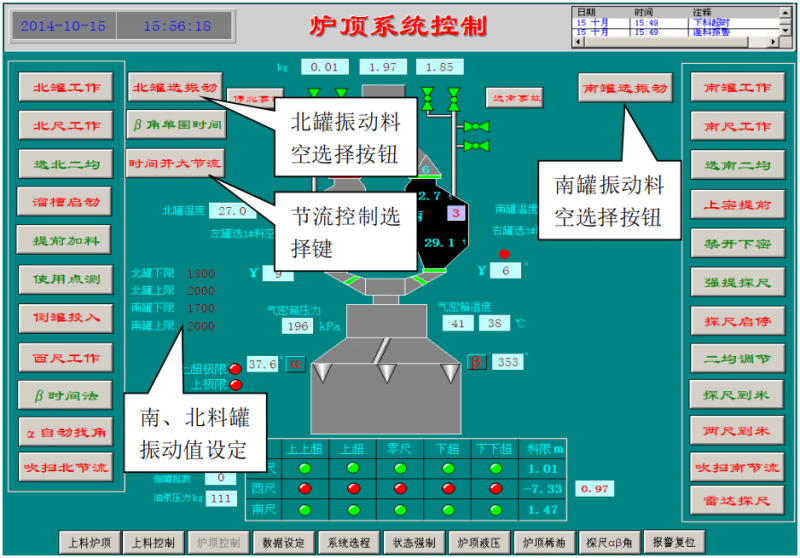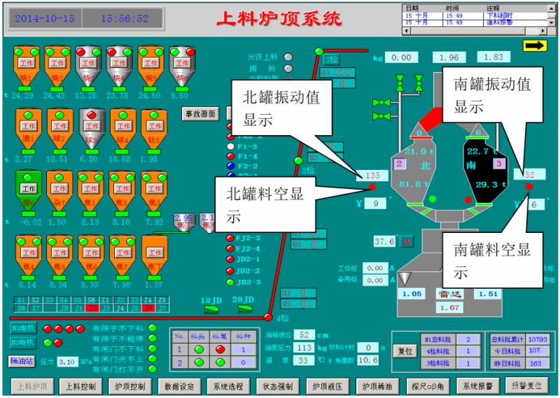 上位機程序軟件可實現(xiàn)功能:南、北料罐測振料空顯示;南、北料罐南放料時間顯示、料罐正在放料時蓬料報警;南、北料罐測振時間法料空切換畫面;南、北料罐 15 批料放料時間顯示。