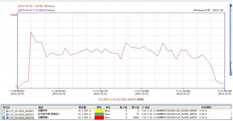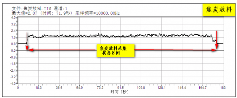 ③如下圖南罐在 11:19:47 開始放焦炭,11:21:30 料罐料空;放料期間振動值最大值達到 8950,最小值達到 4874;放料時間為 100 秒。