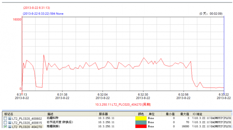 ②如下圖 13 左罐在 9s 時開始放焦碳,177s 料罐料空;放料期間振動值最大值達到 2.07V,電流信號經 PLC(400-4000)的量程轉換后,整體振蕩在 2000 左右的區(qū)間內瞬時值如圖 14,放料時間約為 168 秒。