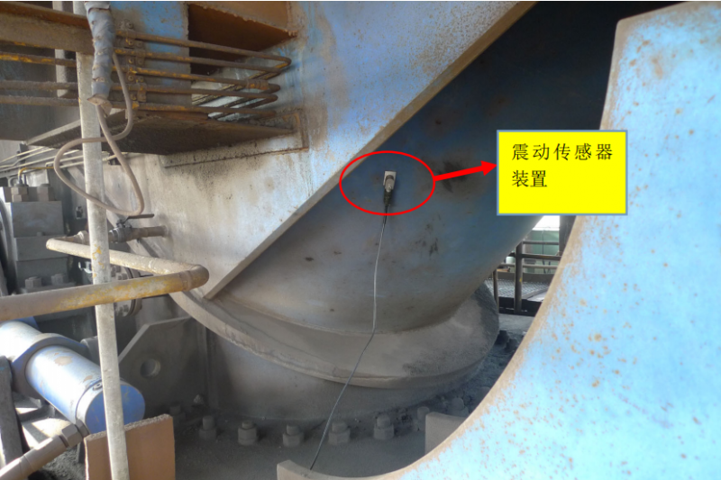 將振動檢測傳感器貼在下密閥與節(jié)流閥之間的管道外壁處,選擇振動值顯示較大而且在放料結束時振動值顯示立即減小的位置見圖 10,經過在線測試,確認了振動檢測裝置的恰當位置,能夠如實的反映料罐的放料情況,并通過圖線的變化趨勢和幅值得出料空時的狀態(tài)和料空時間并能區(qū)分料罐放料時的材料。