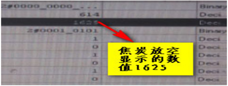 ①如下圖 11 所示左罐在 700s 時開始放礦石,860s 時料罐料空;放料期間振動值最大值達到 2.8V,電流信號經 PLC(400-4000)的量程轉換后,整體振蕩在 2500 左右的區(qū)間內, 瞬時值如圖 12,放料時間為 160 秒左右。其中零罐顯示為相鄰右罐焦炭放料時采集到的振動信號,可作為右罐放料時間校準的參考。