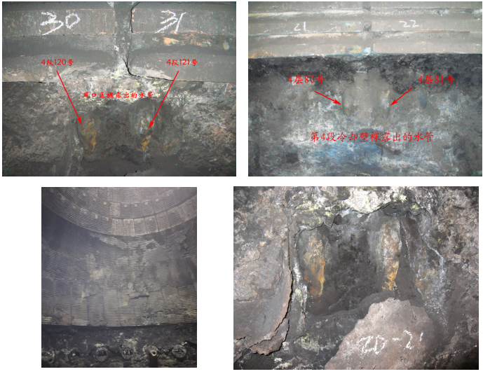 3、爐身鑄鐵冷卻壁的主要原因主要表現(xiàn)在冷卻壁出水管根部由于剪應(yīng)力導(dǎo)致的冷卻水管開裂漏水,其次是冷卻壁熱面鑲磚脫落,冷卻壁受爐料及煤氣流的沖刷和侵蝕逐漸變薄,使熱面產(chǎn)生橫向和縱向裂紋,導(dǎo)致冷卻水管外露,發(fā)展到一定程度即可造成冷卻水管損壞漏水。