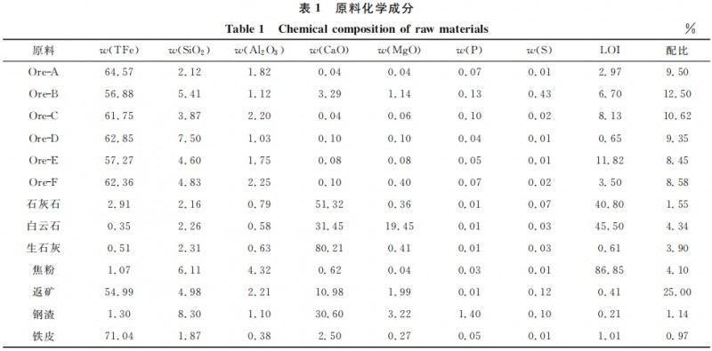 本研究以國內(nèi)某鋼鐵公司實際燒結(jié)生產(chǎn)中使用的燒結(jié)原料,包括:鐵礦粉、燃料、返礦、熔劑等,其化學成分及配比見表1。