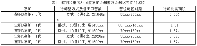是什么原因造成這么大的差別?寶鋼3、4高爐其操作水平、冶煉強度、用料結(jié)構(gòu)及穩(wěn)定性、施工質(zhì)量等可以說應(yīng)當(dāng)是相同的,國內(nèi)外屬一流,也找不出不足之處。差在什么地方?表1中列出三座高爐的冷卻壁結(jié)構(gòu)及冷卻比表面積