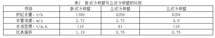 (4)表2例出臥式冷卻與豎排立式冷卻壁達到同樣水流密度的比較,這是寶鋼同志根據(jù)他們情況計算結(jié)果,供參考。表中的同樣達到119的水流密度,立式冷卻壁只能在冷卻比表面積上下功夫,4.0m/s水速其系統(tǒng)要整體升級。