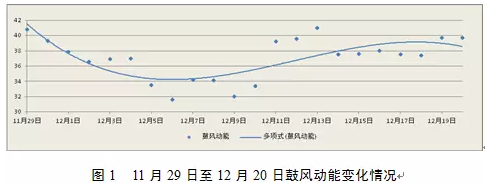 進(jìn)入12月份后,鼓風(fēng)動能逐步回縮,至12月6日降低至波谷(31.6 kJ/s),隨后開始漫長的恢復(fù)過程,至12月21日平均鼓風(fēng)動能逐步上升至40.1 kJ/s,爐況基本恢復(fù)正常,期間經(jīng)歷19天的恢復(fù)時間,產(chǎn)量及經(jīng)濟(jì)指標(biāo)受影響較大。