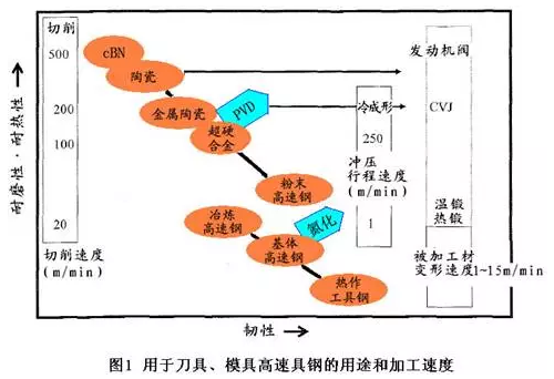 高速鋼由于可提高切削加工效率,所以被大量用來作為刀具,但也有利用高速鋼的特性,將高速鋼用于各種塑性加工模具的情況。圖1是目前刀具、模具用高速鋼的耐磨性、耐熱性和韌性匹配的示意圖。圖中還標(biāo)示出冷成形和熱鍛的加工速度。