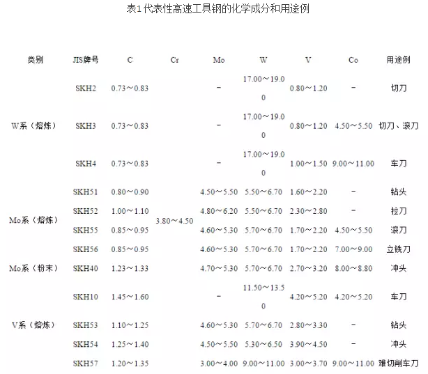 如上所述,根據(jù)添加元素,可將高速鋼分為W系、Mo系、V系三大類別。JIS中主要高速鋼的成分和用途如表1。