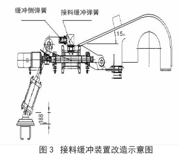 接料裝置由接料臂、頂升氣缸組成。由于氣缸直接安裝在基礎(chǔ)上,接料臂無緩沖彈簧,氣缸連接銷耳極易被沖擊負(fù)荷擊斷,造成故障。根據(jù)現(xiàn)場設(shè)備受力分析,對接料托臂進(jìn)行改造,增加4 組箱型緩沖彈簧,分別吸收正向、側(cè)向坯料落下沖擊載荷,減少勢能對氣缸連接銷耳沖擊。氣缸底座利用現(xiàn)場基礎(chǔ),將原板式結(jié)構(gòu)設(shè)計(jì)為直角型,分解部分沖擊力對基礎(chǔ)造成的損壞,接料托臂改造見圖3。