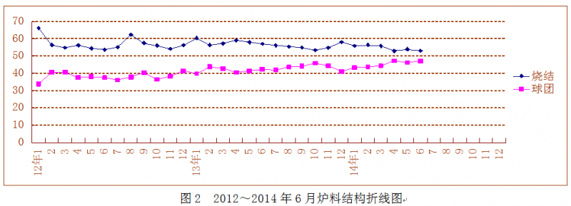 近年來隨著國內(nèi)球團礦產(chǎn)量大幅增加,不僅中小型高爐煉鐵普遍使用球團礦,大型高爐也加大了球團礦的入爐比例。國內(nèi)高爐煉鐵入爐酸性氧化球團礦比例一般為20%左右,再增加則容易出現(xiàn)高爐爐況難行,只有少數(shù)煉鐵企業(yè)達到30%以上入爐比例。而從世界先進的高爐煉鐵爐料結(jié)構(gòu)看,增加球團礦用量是國內(nèi)外煉鐵高爐爐料結(jié)構(gòu)發(fā)展趨勢。國內(nèi)外的理論研究和生產(chǎn)實踐表明:球團礦作為良好的高爐爐料,具有品位高、強度好、易還原、粒度均勻等優(yōu)點,酸性球團礦與高堿度燒結(jié)礦搭配的爐料結(jié)構(gòu)較為理想[1],利于冶煉時爐內(nèi)形成合理的軟熔帶,煤氣利用好,爐況改善,適宜冶煉低硅生鐵;進而實現(xiàn)高爐增產(chǎn)節(jié)能、提高經(jīng)濟效益。