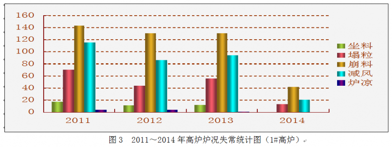 1)爐況順行穩(wěn)定、煤氣利用改善。通過強化球團礦高比例入爐操作方面的探索研究,裝料、送風、造渣等各項冶煉制度改進,高爐操作優(yōu)化,實現(xiàn)爐況順行穩(wěn)定和煤氣合理利用。高爐崩料、塌料、坐料次數(shù)明顯降低,大的爐況事故基本消除。2011年~2014年1號、2號爐況失常情況如圖3、圖4所示。