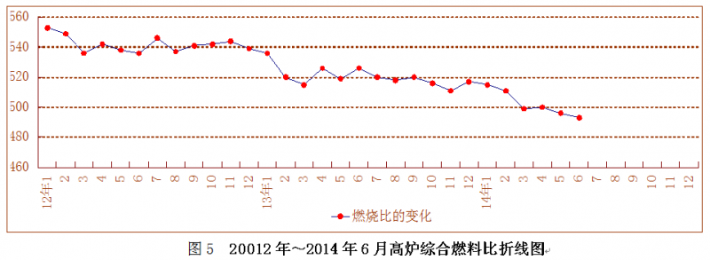 4)促進高爐節(jié)能降耗。焦丁的配加從2012年噸鐵平均28 kg/t鐵,提高到目前的40 kg/t鐵以上,綜合燃料比從年平均540 kg/t鐵下降到492 kg/t鐵,下降了48 kg/t鐵,在煉鐵指標改善的同時取得了顯著的經(jīng)濟效益。20012年~2014年6月高爐綜合燃料比折線如圖5所示。
