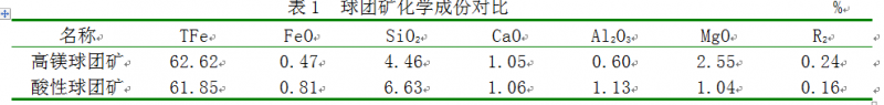 永通鑄管公司3座10 m2豎爐年產(chǎn)酸性氧化球團礦140萬t,球團礦作為高爐酸性爐料,具有品位高、粒度小而均勻、強度高、還原性好等優(yōu)點,提高球團礦入爐比例后,如高爐能夠保持穩(wěn)定順行,對高爐燃料比降低非常有利。但球團礦存在還原膨脹率高,軟化、熔滴溫度低等高溫冶金性能差等問題,特別是球團礦的荷重軟化溫度較低對高爐生產(chǎn)造成不利影響。通過添加MgO等措施,可以改善球團礦的冶金性能[3],為高爐高產(chǎn)、優(yōu)質(zhì)、降耗創(chuàng)造條件。