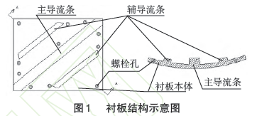 2)改造襯板的結(jié)構(gòu)形式。原有的襯板為平板式、光面,易粘料。改造后的襯板設(shè)計有一個主導(dǎo)流條和兩條輔導(dǎo)流條。主導(dǎo)流條為“一”字形,設(shè)置在襯板的對角線位置。輔導(dǎo)流條為“一”字形,設(shè)置在主導(dǎo)流條的兩側(cè),對稱分布。圖1 為襯板結(jié)構(gòu)示意圖。
