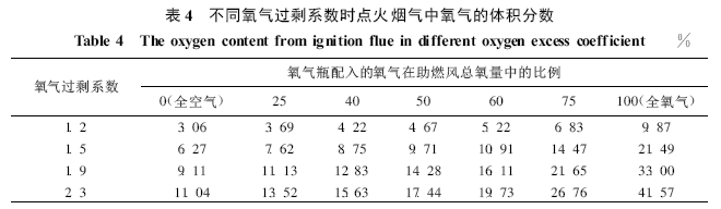 試驗(yàn)采用天然氣作為點(diǎn)火的燃料, 空氣或者空氣和氧氣的混合氣體作為助燃風(fēng)。為了得到高的燃燒溫度, 氧氣過剩系數(shù)要大于1.0 , 以保證完全燃燒,但應(yīng)該盡可能減小氧氣過剩系數(shù)。從表4 可以看出, 要想增大煙氣中氧氣的含量又不讓氧氣過剩系數(shù)太高, 唯一的辦法是在空氣中配入一定量的氧氣。換言之, 為提高燃燒溫度, 增加煙氣中氧氣的含量,又能減小氧氣過剩系數(shù), 采用富氧進(jìn)行點(diǎn)火是有效而唯一的選擇。