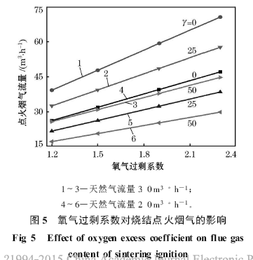 同時(shí)可以看出, 在燒結(jié)點(diǎn)火可行的條件下, 適當(dāng)降低天然氣流量, 不但可以降低點(diǎn)火能耗, 而且煙氣排放量降低的幅度很大。當(dāng)天然氣流量為3m3 ·h-1時(shí), 氧氣過剩系數(shù)為1.2 , 助燃風(fēng)全為空氣的情況下,煙氣中的氧氣的體積分?jǐn)?shù)僅為3.06 %, 煙氣排放量為39.15m3 ·h