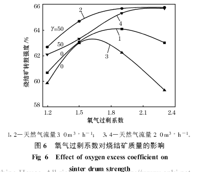 -1 , 空氣作為助燃風(fēng), α為1.9 時(shí), 燒結(jié)礦轉(zhuǎn)鼓強(qiáng)度為64.07 %, 利用系數(shù)為1.37 t ·m -2 ·h -1 ;當(dāng)γ值提高到50 %, 天然氣流量降低到2m3 ·h -1 , α為1.9 時(shí), 可以獲得65.30 %的轉(zhuǎn)鼓強(qiáng)度和1.44 t ·m-2 ·h-1的利用系數(shù)。