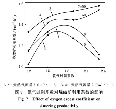 從圖7 可以看出, 在空氣作為助燃風(fēng)時(shí), 隨著氧氣過剩系數(shù)的增大, 煙氣中的氧氣含量有所提高, 適當(dāng)提高氧氣過剩系數(shù)可以提高燒結(jié)礦的利用系數(shù),但進(jìn)一步提高氧氣過剩系數(shù), 使點(diǎn)火的溫度降低, 同時(shí)煙氣總量增加造成廢氣攜帶的熱量也增加, 以致于燒結(jié)礦的利用系數(shù)出現(xiàn)先升后降的趨勢(shì)。然而把γ提高到50 %, 燒結(jié)礦的利用系數(shù)則隨著氧氣過剩系數(shù)的增大而得到提高, 只是上升的幅度越來越小。從圖7 可以看出, 助燃風(fēng)中配入一定量的氧氣, 是非常有必要的, 但γ值在50 %以下可有明顯效果, 再提高富氧程度, 效果便越來越不明顯。同時(shí)可以看出,在助燃風(fēng)中配入一定量的氧氣后, 在較低的燃料用量下就能正常進(jìn)行點(diǎn)火, 而且與空氣作為助燃風(fēng)的情況相比, 燒結(jié)礦的生產(chǎn)率得到明顯提高。在天然氣流量為3m3 · h-1 , 空氣作為助燃風(fēng), α為1.9 時(shí),燒結(jié)礦的利用系數(shù)為1.37 t · m-2 · h-1 ;當(dāng)γ值提高到50 %, 天然氣流量降低到2m3 · h-1 , α為1.9時(shí), 燒結(jié)礦的利用系數(shù)提高到1.44 t ·m-2 · h -1 。