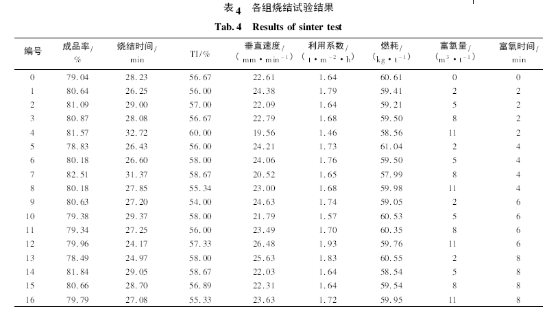 按照表3 中的方案進(jìn)行試驗(yàn),并對(duì)其中個(gè)別試驗(yàn)進(jìn)行了重復(fù)和驗(yàn)證試驗(yàn). 為了獲得較佳的燒結(jié)性能,對(duì)基準(zhǔn)組試驗(yàn)進(jìn)行了反復(fù)摸索,并最終確定第0 組試驗(yàn)基準(zhǔn)方案. 基準(zhǔn)及各富氧燒結(jié)試驗(yàn)結(jié)果見表4.