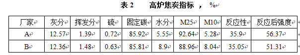 煉鐵廠高爐用焦炭全部外購,家數(shù)達(dá)到10余家,質(zhì)量參差不齊,具有代表性的A、B兩個廠家的焦炭指標(biāo)見表2。通過與表3對比發(fā)現(xiàn),無論是A廠家焦炭還是B廠家焦炭,耐磨強(qiáng)度、反應(yīng)性和反應(yīng)后強(qiáng)度等主要指標(biāo)均低于相應(yīng)的指標(biāo)要求。而且,A、B兩家焦炭還存在較大的指標(biāo)差別。