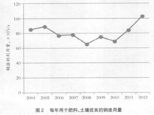 表4 所示鋼渣的組成是轉(zhuǎn)爐渣的組成。鋼渣有鐵水預(yù)處理渣和轉(zhuǎn)爐渣。鐵水預(yù)處理渣也有SiO2含量超過20%的,可作為硅酸肥料的原料利用。比較表4 中高爐渣和鋼渣的組成可知,鋼渣中除含有Ca、Si 外,還含有Mg、Mn、Fe、P 等肥料的有效成分。高爐渣中Al 含量高。Al 容易與土壤中的磷酸結(jié)合,是阻礙植物吸收磷酸的元素。所以,最好用以鋼渣為原料的肥料。圖1 和圖2 是日本鋼鐵渣協(xié)會統(tǒng)計的分別用于肥料、土壤改良的高爐渣、鋼渣的年使用量的變化。從圖1 可以看出,2008-2012 年度每年用于肥料、土壤改良的高爐渣用量在15 萬噸左右。圖2 顯示,2010 年度用于肥料、土壤改良的鋼渣量約為6.9 萬噸,經(jīng)過連續(xù)兩年增加,到2012年度已增加至10.3 萬噸。也許是因為以鋼渣為原料的肥料的有用性正處于被認(rèn)識的階段。