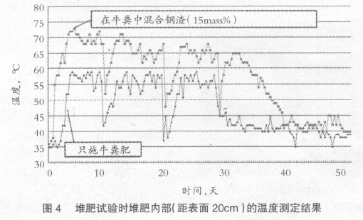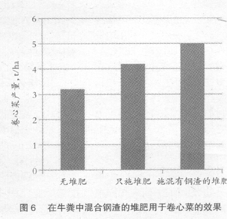 家禽畜糞便形成的堆肥可以作為含有N、P 的肥料利用。在家禽畜糞便中混合鋼渣,制或除含有N、P 外,還含有Ca、Si、Mg、Mn、Fe 等成分的堆肥。在牛糞中混合15%的鋼渣與不混合鋼渣制堆肥的試驗中,在距堆肥表面20cm 深處測定的溫度變化示于圖4?;旌箱撛鼤r,溫度約上升到70℃,而不混合鋼渣時只上升到58℃。每10 天進行翻動時,溫度暫時下降,但其后再次上升?;旌箱撛鼤r,堆肥內(nèi)部溫度保持在65-70℃,所以認(rèn)為短時期可以堆肥化。圖5 是將制作的堆肥用于小松菜后,堆肥腐熟度的調(diào)查結(jié)果。