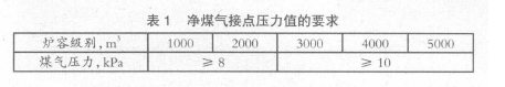 (10)確定熱風(fēng)爐凈煤氣接點(diǎn)壓力時(shí),應(yīng)包括余熱回收裝置阻損在內(nèi)的系統(tǒng)流路阻力損失。凈煤氣接點(diǎn)壓力值應(yīng)符合表1 的規(guī)定。