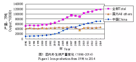高爐工藝。在過(guò)去的10余年里,在我國(guó)生鐵產(chǎn)量高速增長(zhǎng)的帶動(dòng)下,世界生鐵的總量持續(xù)增加,2014年全球高爐煉鐵的產(chǎn)量為11.795 億噸,見(jiàn)圖1。國(guó)外生鐵總產(chǎn)量基本維持不變,2014年為4.679億噸,占39.67%;我國(guó)為7.116億噸,占60.33%。