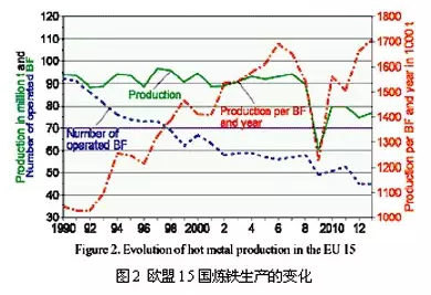 生產(chǎn)狀況。歐盟15國(guó)的生鐵產(chǎn)量已從2008年前的年產(chǎn)9000多萬(wàn)噸下降到近幾年的不足8000萬(wàn)噸,見(jiàn)圖2(2013年7690萬(wàn)噸)。高爐運(yùn)行數(shù)量由1990年的92座降低到目前的45座,但單爐產(chǎn)量則由104萬(wàn)噸/年提高到目前的171萬(wàn)噸/年。