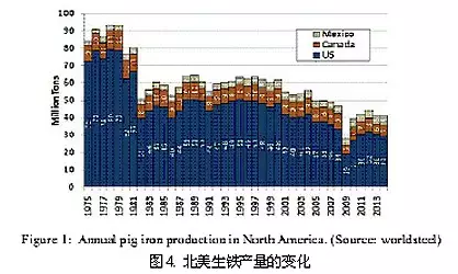生產(chǎn)情況。在過(guò)去的40年里,北美的生鐵產(chǎn)量逐漸降低,見(jiàn)圖4,2014年為4200萬(wàn)噸。其主要競(jìng)爭(zhēng)者是廢鋼電爐生產(chǎn)流程。電爐鋼占半數(shù)以上,鐵鋼比僅為0.4。