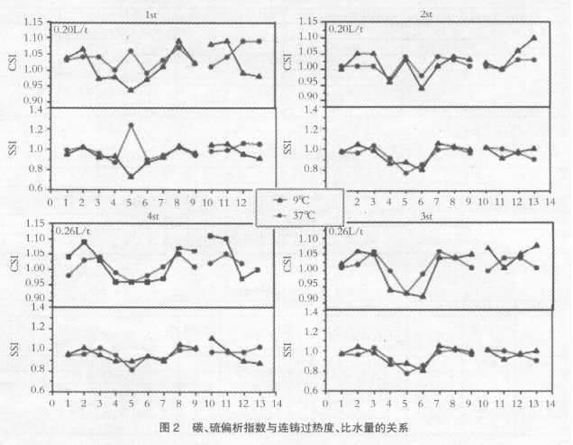 從表2 可以看出,高過(guò)熱度條件下的碳、硫宏觀偏析明顯好于低過(guò)熱度的情況。以0.20L/t比水量為例,過(guò)熱度為37℃時(shí),碳的偏析指數(shù)(取1st、2st 平均值)為0.98-1.06,標(biāo)準(zhǔn)差為0.025,碳、硫含量極差分別為0.03%、0.0045%,而過(guò)熱度為9℃時(shí),碳偏析指數(shù)為0.94-1.10,標(biāo)準(zhǔn)差為0.04,碳、硫含量極差分別達(dá)0.06%、0.0085%。