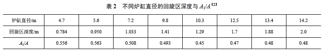 大型高爐或特大型高爐的特點(diǎn)是爐缸直徑較大,這對(duì)煤氣流的正常分布和死料柱內(nèi)液態(tài)渣鐵的流動(dòng)有很大阻礙,回旋區(qū)向爐內(nèi)穿透的深度只有2m,隨爐缸直徑增大,煤氣將更直接地流向邊緣。爐缸直徑4m 的高爐,其活躍環(huán)覆蓋了回旋區(qū)水平面上的整個(gè)面積,但如果爐缸直徑增大到14m,則活躍區(qū)面積將減小到50% 以下,在原料質(zhì)量滿足不了要求的時(shí)候極易產(chǎn)生爐缸堆積。由于半徑方向的這種差異,管理和控制煤氣流及其分布的技能對(duì)于大型高爐更加重要。增大爐缸活躍區(qū)對(duì)爐缸渣鐵排放能力也有重要影響,特別是在需要維持爐缸中心足夠的溫度和透氣性時(shí)回旋區(qū)有個(gè)適宜的深度,過(guò)大或過(guò)小將造成中心或邊緣氣流的發(fā)展。爐缸直徑越大,回旋區(qū)應(yīng)該越深,已使煤氣流向中心擴(kuò)展,使中心保持一定的溫度,控制焦炭堆積數(shù)量,維持良好的透氣性和透液性,但回旋區(qū)面積與爐缸的面積之比A1/A,隨爐缸直徑增大而減小。不同爐缸直徑的回旋區(qū)深度與A1/A 見(jiàn)表2。