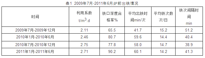 爐前機(jī)物料消耗明顯降低。泥套澆注使用壽命由7天/個(gè)提高到30天/個(gè),炮帽更換個(gè)數(shù)由300個(gè)/月降至25個(gè)/月,鉆桿更換根數(shù)由353.9根/月降至280根/月逐步扭轉(zhuǎn)了爐前生產(chǎn)的被動(dòng)局面。目前,為適應(yīng)高爐高產(chǎn)穩(wěn)產(chǎn)的需要逐步由單鐵口出鐵作業(yè)過渡到雙鐵口出鐵作業(yè),縮短了出鐵間隔時(shí)間,使?fàn)t內(nèi)不至因爐前出鐵不及時(shí)而減風(fēng)。為爐內(nèi)強(qiáng)化冶煉操作提供了前提條件。2009年6月-2011年6月爐前出鐵情況見表1。