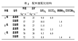 基準(zhǔn)期為C 堆半堆生產(chǎn),使用日常生產(chǎn)熔劑即白灰和白云石粉結(jié)構(gòu),實(shí)驗(yàn)期為C 堆另外半堆生產(chǎn),即白灰、高鎂粉和石灰石粉熔劑結(jié)構(gòu). 為避免熔劑成本大幅升高,實(shí)驗(yàn)期盡量保持白灰配比不變,高鎂粉替代白云石粉造成的CaO 不足,全部由配加石灰石粉補(bǔ)充.