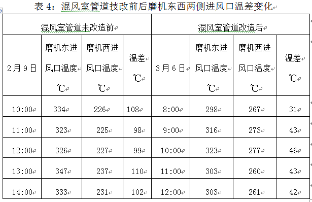 4) 混風(fēng)室循環(huán)風(fēng)管道改造,平衡磨機(jī)兩側(cè)進(jìn)風(fēng)口溫差。