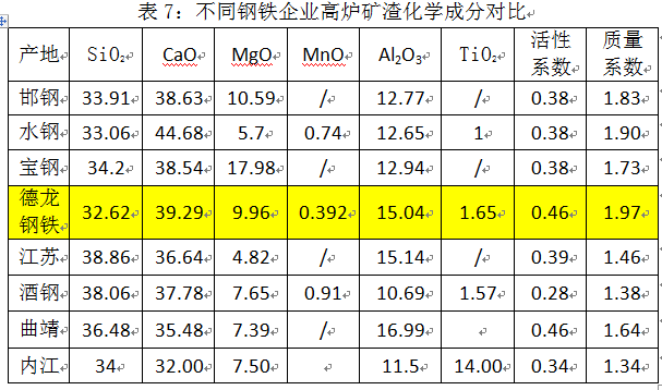 可以看出,經(jīng)過優(yōu)化配用后,德龍鋼鐵礦渣的活性指數(shù)和質(zhì)量系數(shù)均高于邯鋼和水鋼生產(chǎn)的高活性堿性礦渣,為生產(chǎn)出高活性的礦渣微粉奠定了堅(jiān)實(shí)的基礎(chǔ)。